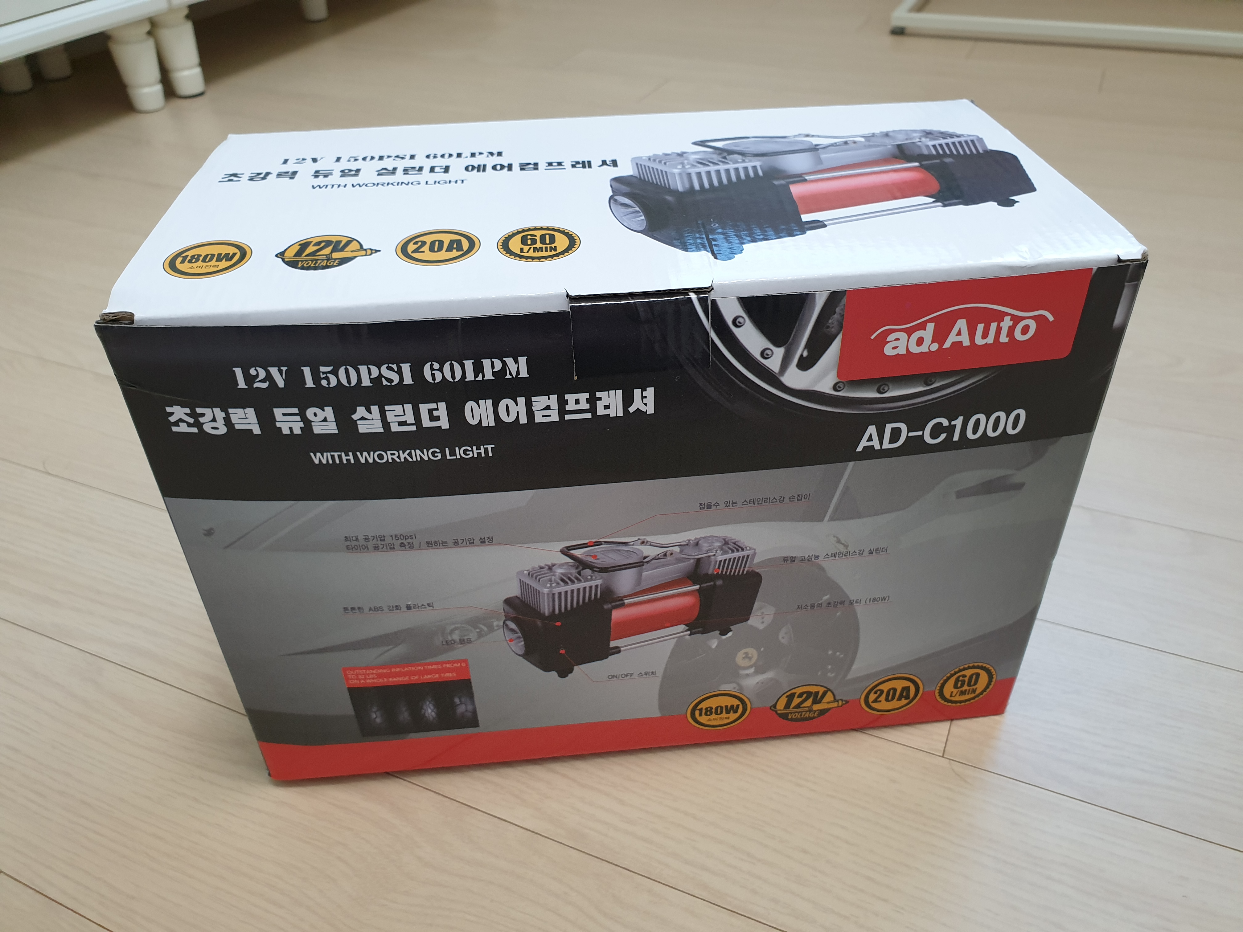 그리고 실린더 개수에 따라 싱글실린더와 듀얼실린더로 구분이 되기도 합니다. 일단 여러 리뷰들을 꼼꼼히 읽어본 결과 휴대용 무선 only 제품(시거잭이나 배터리 연결이 불가한 제품)들 은 싱글실린더 제품들이었고 그래서 공기주입에 시간도 오래걸리며 소음도 크고 발열도 심하고 배터리소모도 빨라 한번 완충 시 네 개의 타이어를 모두 처리하기 힘들 것으로 보여 걸렀습니다. 무선 + 유선 제품이 있었으나 역시 무선 only제품과 별 차이점을 못느꼈습니다. 그러다가 찾은 제품이 AD-C1000 입니다. 이 제품은 무선으로는 사용불가합니다. 자동차 시동을 켜고 시거잭에 꽂거나 본네트를 열어 배터리에 연결을 해서 사용가능합니다. 아래 사진과 영상을 보면서 설명드릴게요.