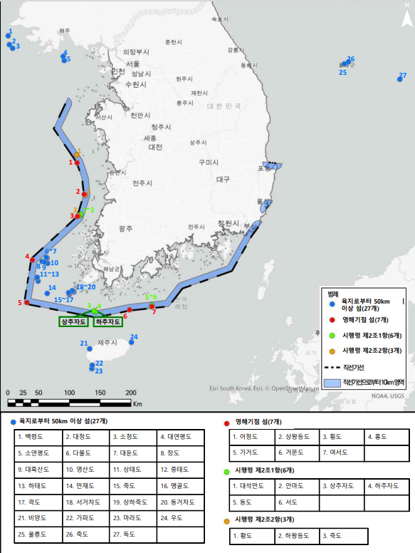 ◦ 육지에서 50km 떨어진 울릉도, 흑산도 등 27개 섬과 「영해 및 접속수역법」제2조제2항에 따른 직선 기전을 정하는 기점 섬 7개 등 34개 섬을 먼섬으로 지정